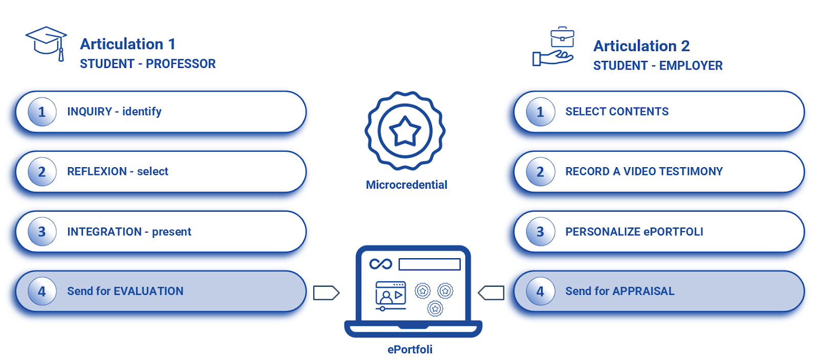 The Employability Skills Micro-credentialing Methodology (ESMC) is structured around two interconnected articulations. In the first, students explore curricular and extracurricular experiences, reflect on them, select evidence, integrate it into a narrative, and submit it for evaluation using rubrics. Once the skill is sufficiently demonstrated, it is recognized with a micro-credential. In the second articulation, the focus shifts to the professional sphere: reviewing the profile, personalizing the ePortfolio, incorporating new evidence, recording a testimonial video based on the STAR method (Situation, Task, Action, Result), which allows for the effective structuring of their experience, and presenting the entire package to potential employers.
